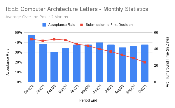 We can see that the acceptance rate initially dropped and has been fluctuating around 35% for the past few months. When a submission arrives to the EIC queue, we have workflows in place to check a manuscript for scope and minimum technical substance. Papers that pass these steps are then sent out for review by the Associate Editor (AE). We’ve found that most manuscripts that eventually get accepted at CAL go through one or more revision rounds (more details on this in the next FAQ). While this acceptance rate is higher than many architecture conferences, we think this is reflective of CAL receiving many good papers and reviewers being more welcoming of early-stage results and new directions of work so long as they are novel, technically sound, and the authors take into account reviewer feedback through the revision rounds.