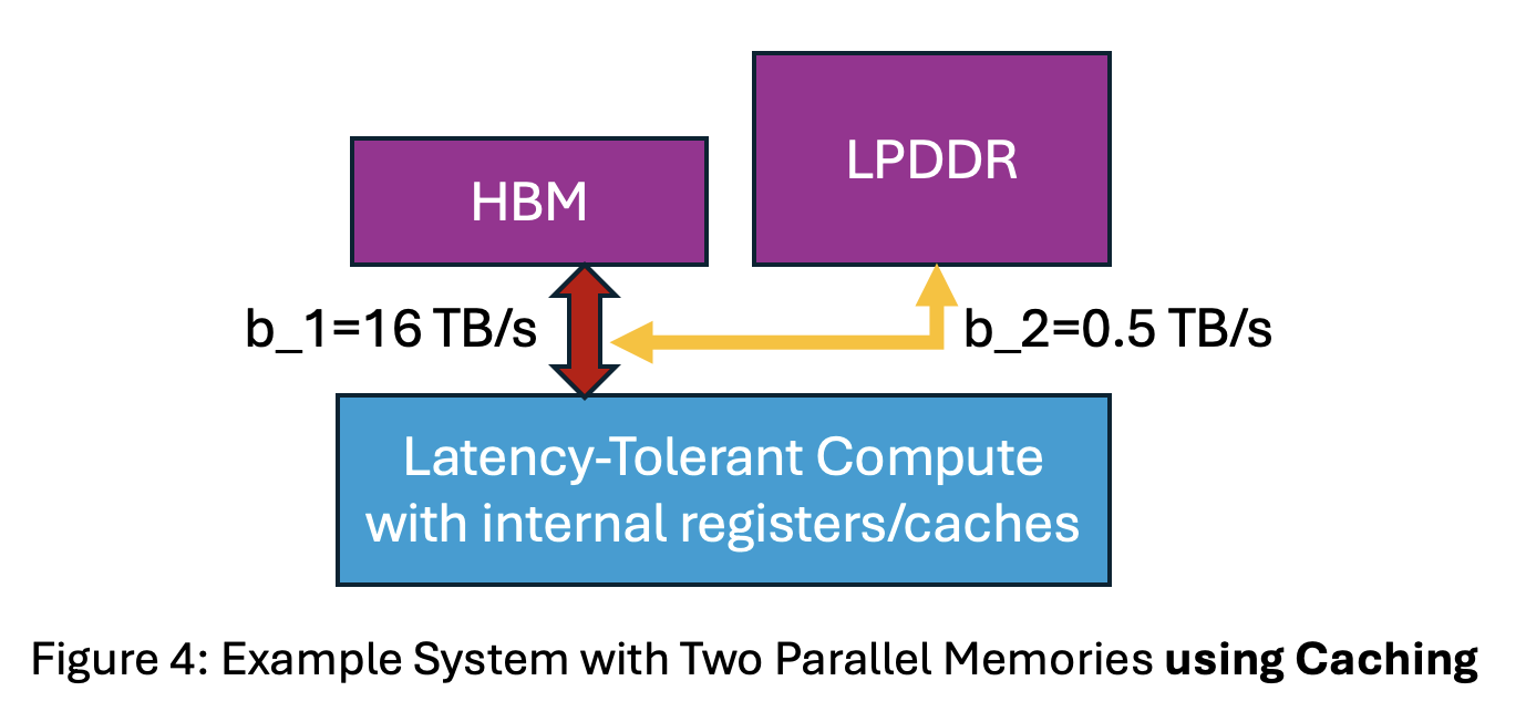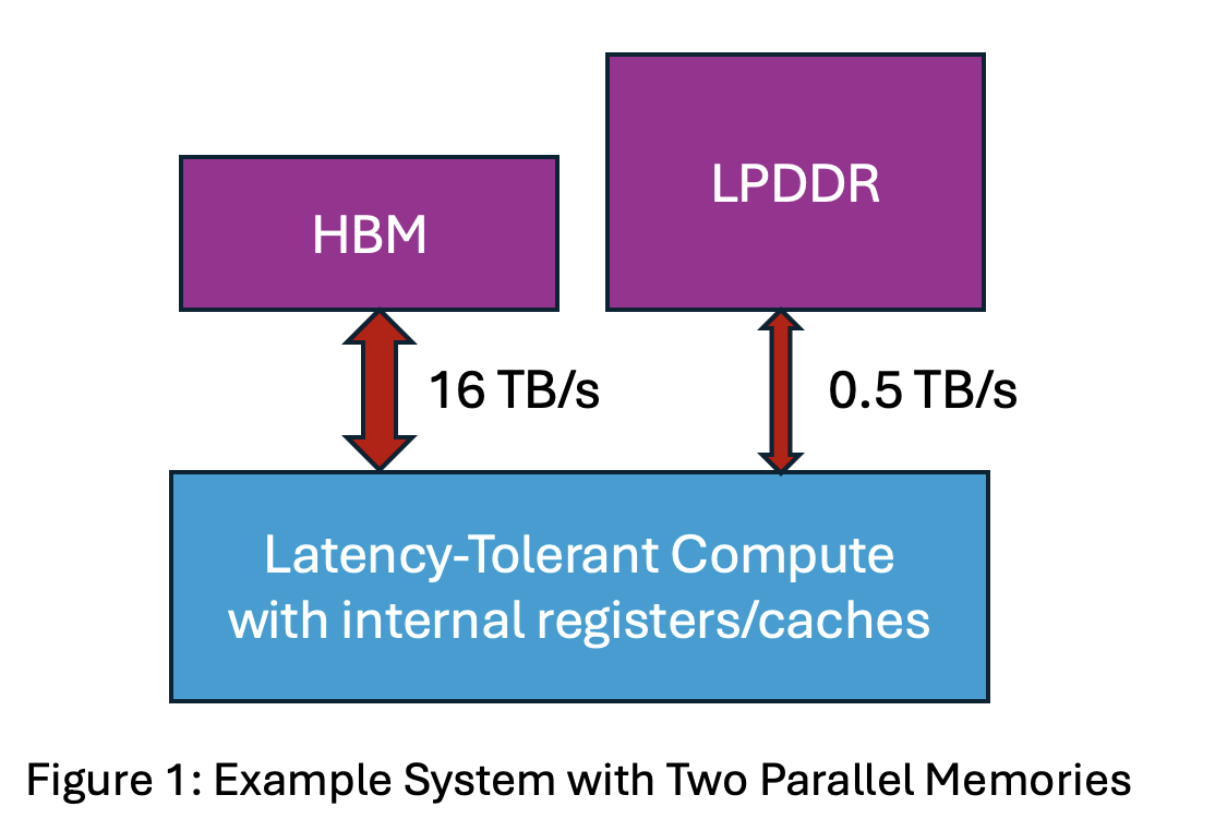 Let’s start simple. Consider the hardware depicted in Figure 1 with High Bandwidth Memory (HBM) with bandwidth 16 TB/s in parallel with an LPDDR memory with bandwidth 0.5 TB/s. Assume for now that there are no transfers between memories, e.g., to cache.