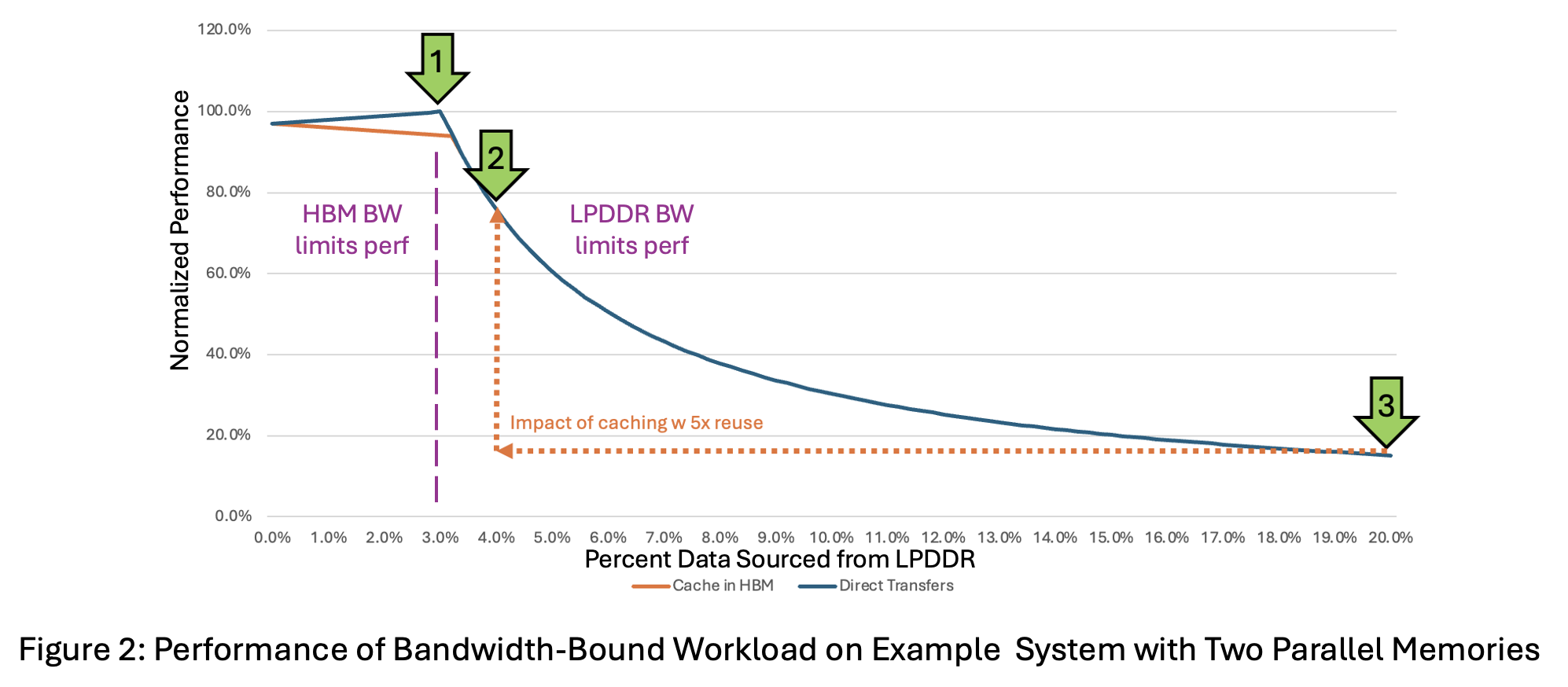 Figure 2 shows an orange curve for caching that is hidden under the original blue curve when more than 3% of data is sourced from LPDDR. At more than 3% from LPDDR, performance–without and with caching–is limited by the time to transfer needed data with the same limited LPDDR bandwidth.