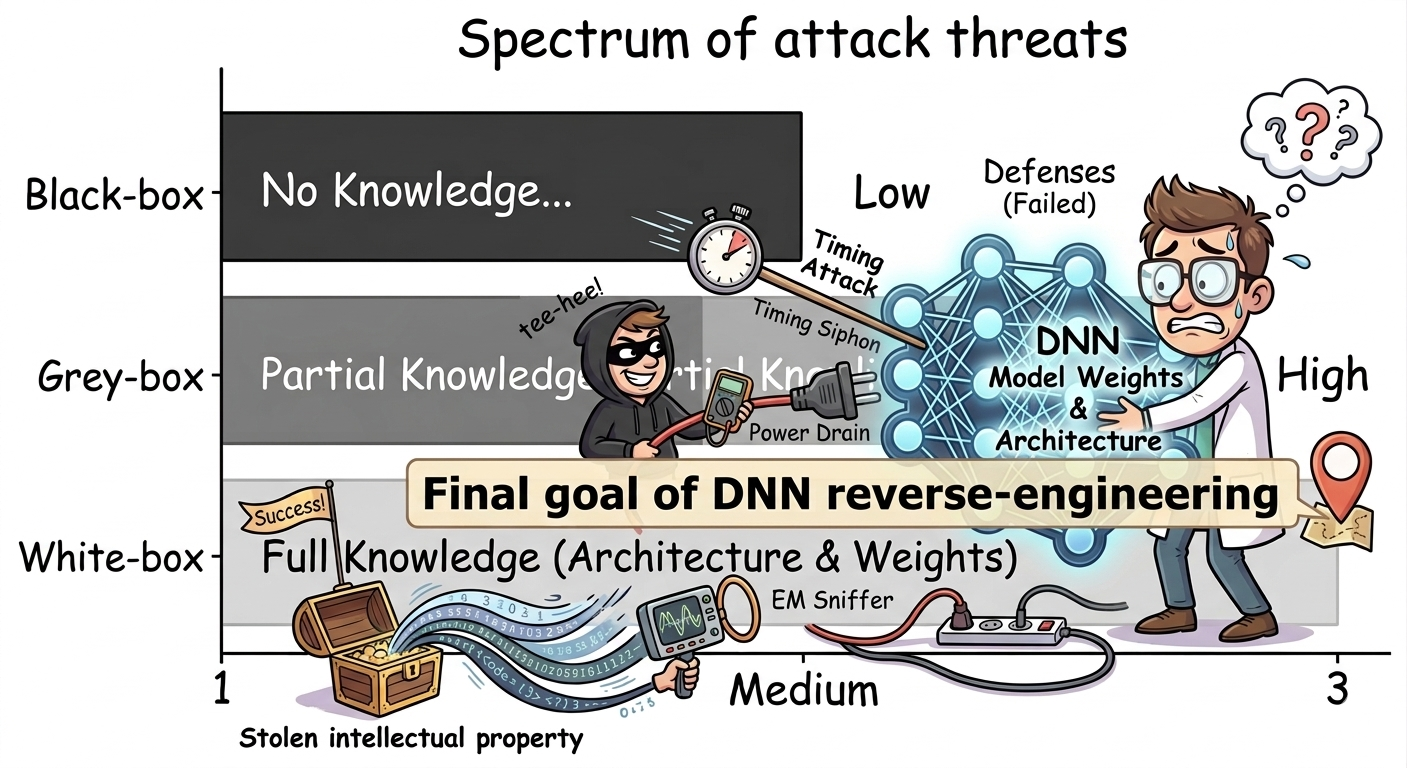 Years ago, I came across three pioneering works (CSI-NN, Cache Telepathy, and DeepSniffer) in the field of reverse engineering neural networks that inspired my journey into side-channel attacks to uncover the secrets of modern Deep Neural Networks (DNNs). Fast forward to today, and there has been significant exploitation of side-channel attacks to discover the secrets of neural networks. It’s a good time to provide an overview of where we stand, the outlook for the future, and the challenges ahead.