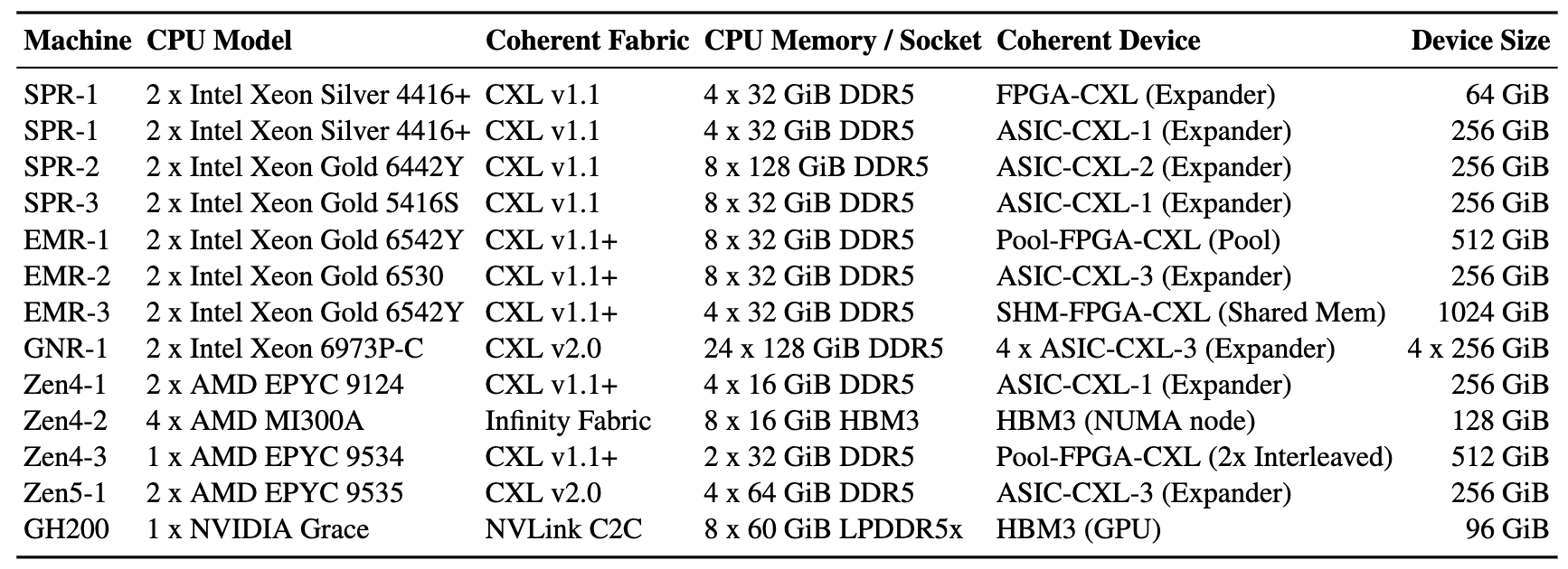 This work is made possible with 8 PhD students from 4 UCSD research groups working over 1.5 years, with wide industrial collaborations. Together we measured 13 server systems, across 3 CPU vendors with a wide range of CPU generations, 3 types coherent fabric links, 5 device vendors, and multiple system configurations (including local vs. remote NUMA, Sub-NUMA clustering mode, interleaved mode, etc.).
