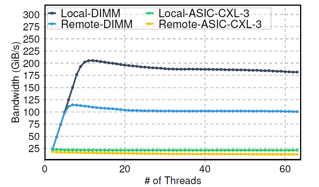 We observed a critical performance asymmetry on the tested AMD platforms. While load (read) bandwidth scaled with thread count, the store (write) bandwidth for ASIC CXL devices remained flat and low, regardless of the number of threads. This indicates a potential “performance asymmetry” for certain workloads on these platforms, where a very small number of cores can achieve the peak bandwidth with stores vs. loads.
