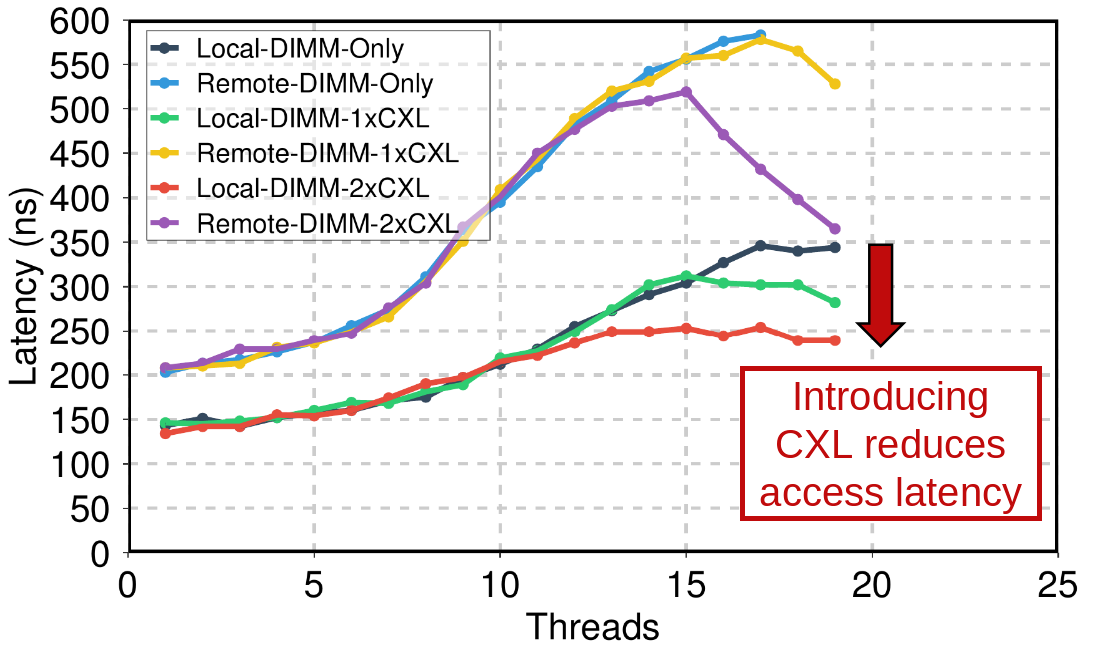 - Latency improvement: Once CXL devices were active, total memory latency dropped compared to using only DIMMs. E.g., the “Local-DIMM + 1xCXL” has lower read latencies than using solely local DIMMs.
