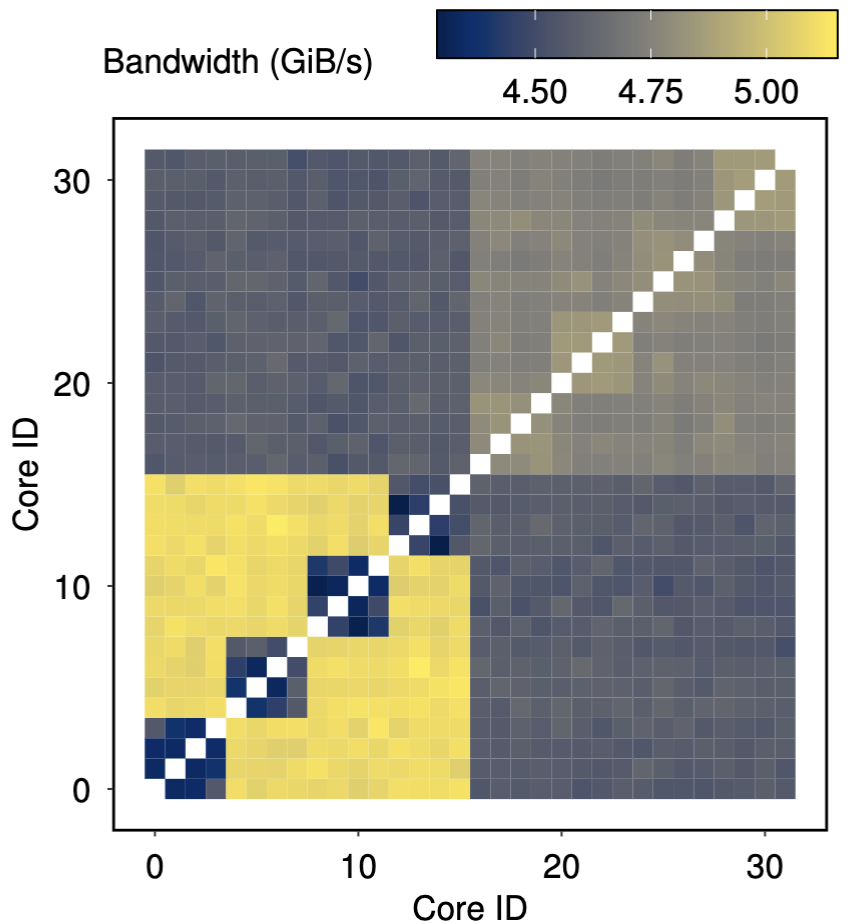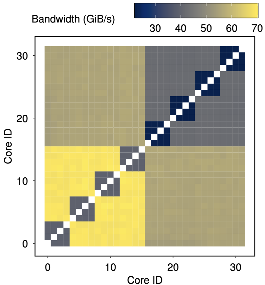 Workload pinning should also take chiplet performance into consideration. As illustrated in the above figure, chiplet architecture impacts the bandwidth of accessing not just DRAM but also CXL; accesses originating from cores within the same chiplet group have a lower bandwidth. While the above example is from Zen4, other chiplet-based CPUs generally have similar performance characteristics.