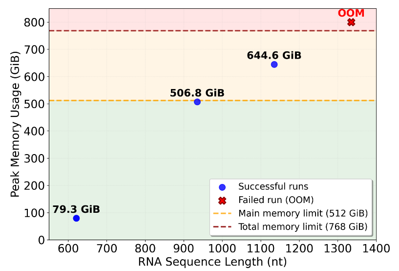 In our experiments with AlphaFold3 accessing CPU DIMM memory: even when most inputs run within system memory capacity, heavy inputs including RNA will require hundreds of gigabytes. On DIMM-only systems these inputs fail with out-of-memory errors, but with CXL memory expanders they complete successfully. Although CXL introduces additional latency, its impact was secondary; capacity expansion was the decisive factor for enabling these workloads.