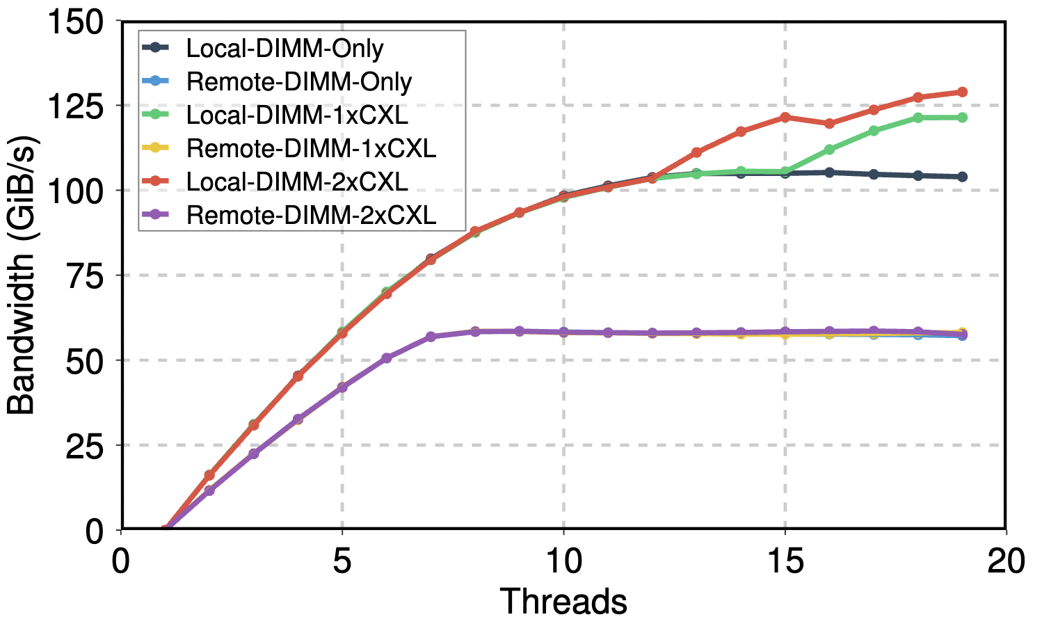 - Bandwidth extension: A single CXL device added roughly 17 GiB/s of bandwidth, while two devices offered about 25 GiB/s. This is below their combined theoretical 50 GiB/s peak, indicating partial utilization.